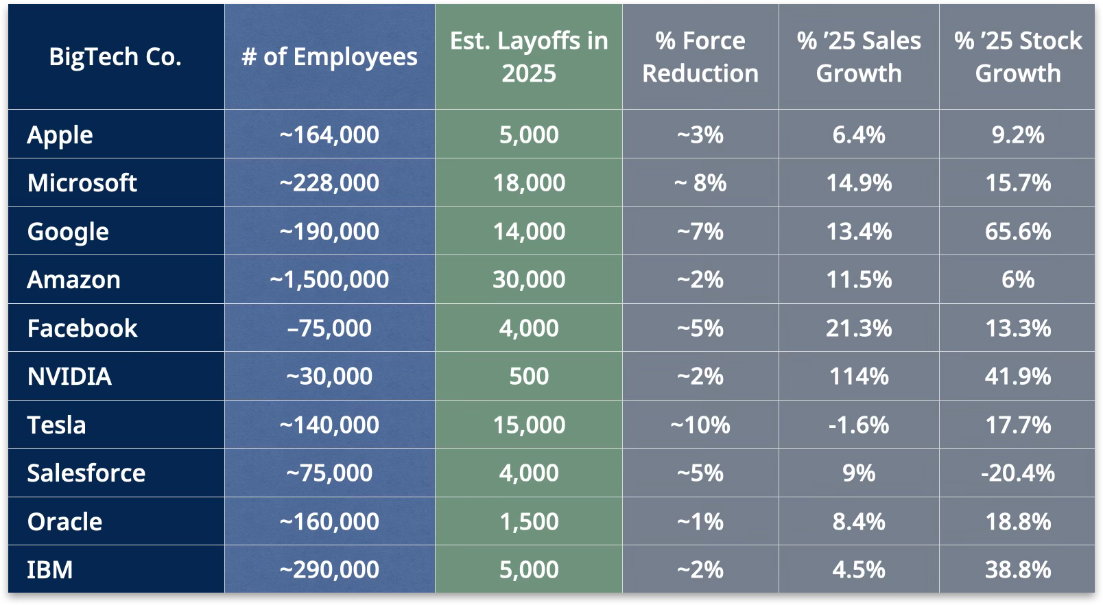 Our Call: DOGE slashes bureaucracy; Google, Meta, Microsoft, Apple follow with efficiency (often AI-powered) driven layoffs.