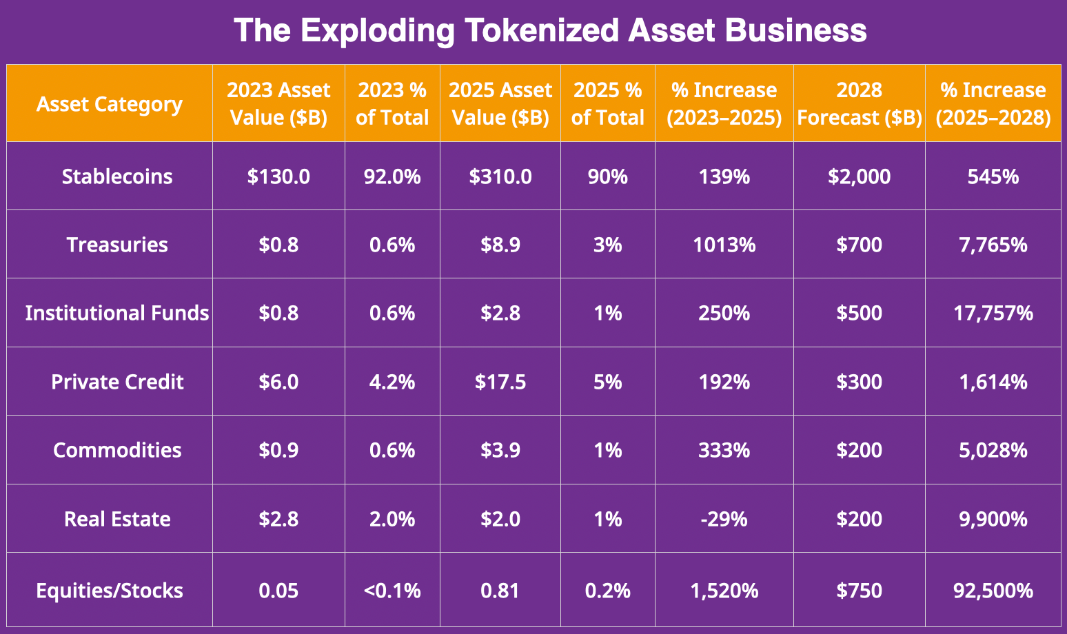Given all the market conditions and projections above, we forecast a ridiculous explosion in the tokenization of real-world assets (RWAs), reaching almost $4 trillion in asset value by 2028. As of January 11, 2026, tokenized RWAs, including stablecoins, represent approximately 10% of the total on-chain cryptocurrency market cap. By 2028, this share is projected to rise to upwards of 30%+.