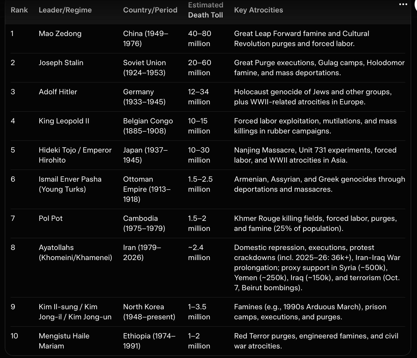 1980–1988 Iran-Iraq War — The regime sent child soldiers in human-wave attacks. Over 1 million total deaths, including 500,000+ Iranians. Chemical weapons were used against their own troops.